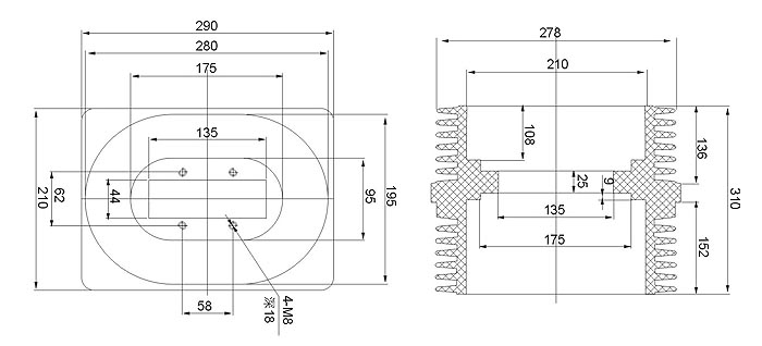 24KV屏蔽套管為環(huán)氧樹脂APG工藝壓力凝膠成型結(jié)構(gòu),外形結(jié)構(gòu)尺寸大小為128(100×100)mm、高225mm。主要適用于額定電壓為10KV及以下的成套設(shè)備中,作絕緣隔離和聯(lián)接過度之用。套管耐污及潮濕,無需特別維護(hù),只需定期地清理表面污質(zhì)。安裝時(shí)母排從孔內(nèi)穿過。