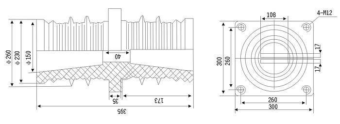 40.5KV穿墻套管為環氧樹脂APG工藝壓力凝膠成型結構,外形結構尺寸大小為128(100×100)mm、高225mm。主要適用于額定電壓為10KV及以下的成套設備中,作絕緣隔離和聯接過度之用。套管耐污及潮濕,無需特別維護,只需定期地清理表面污質。安裝時母排從孔內穿過。